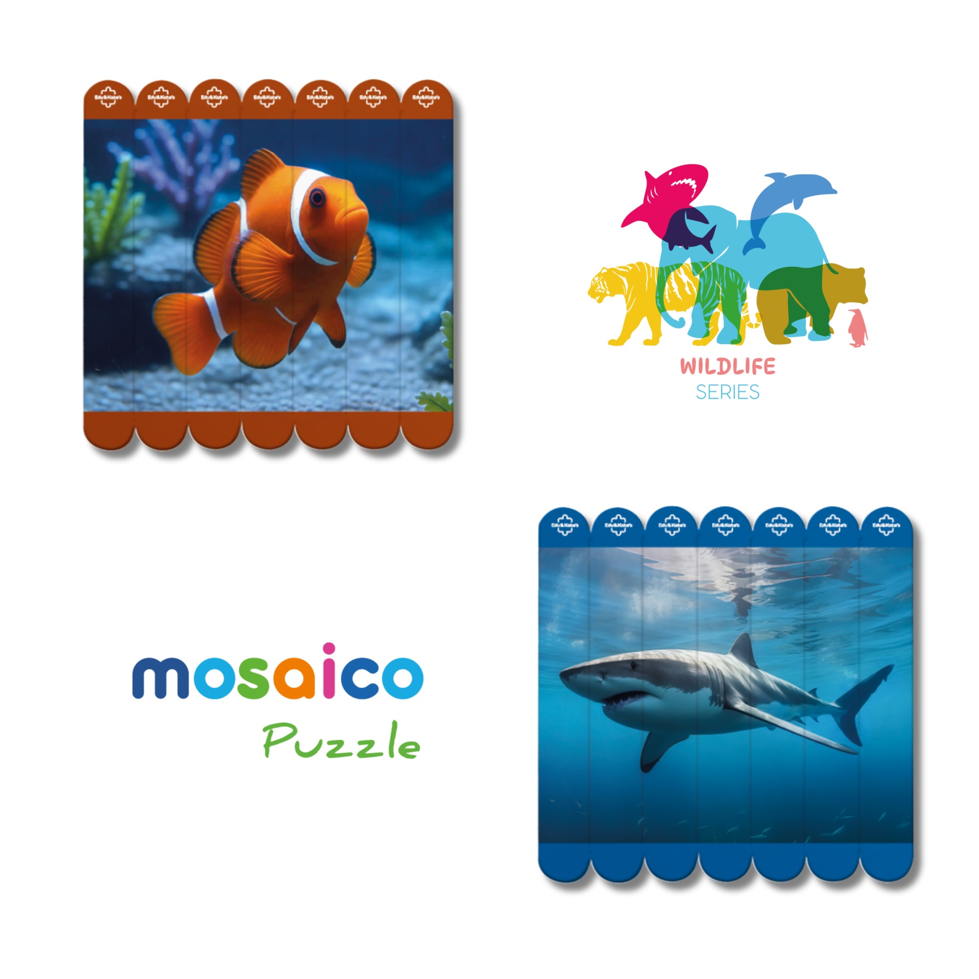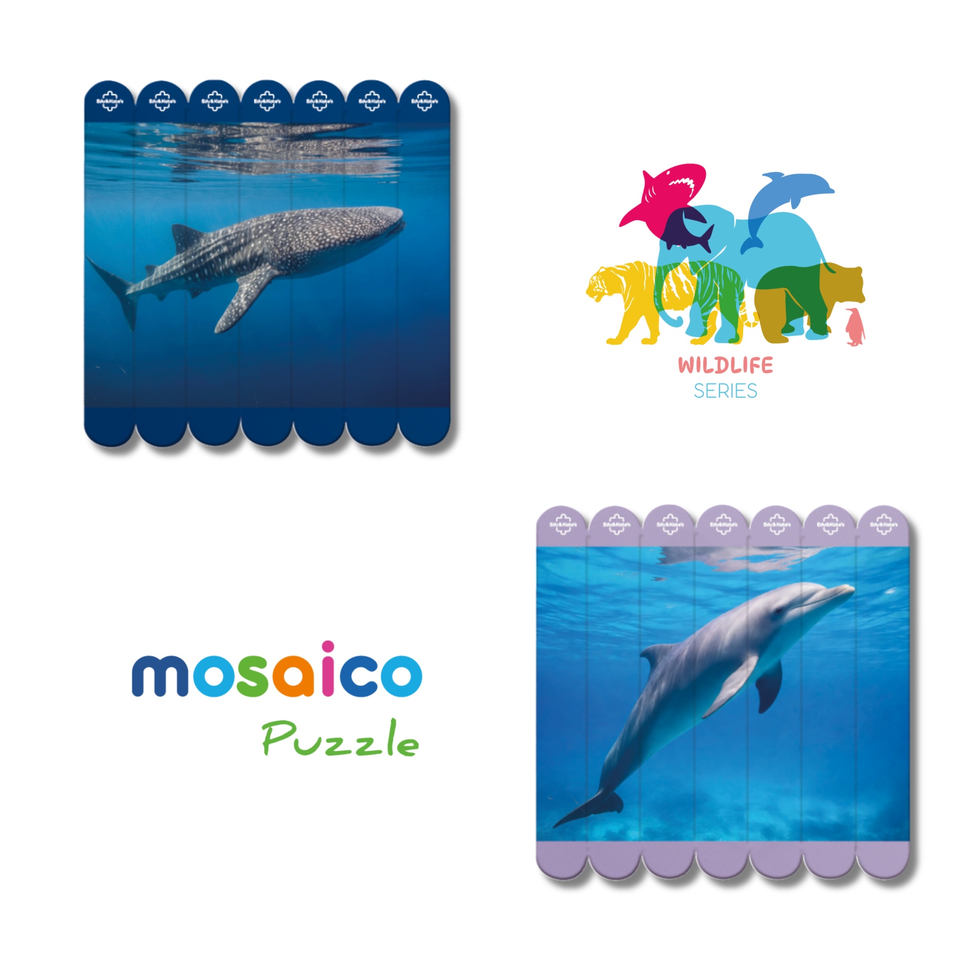 • Mosaico Puzzle sets featuring whale shark and dolphin images with colored tabs and wildlife series logo