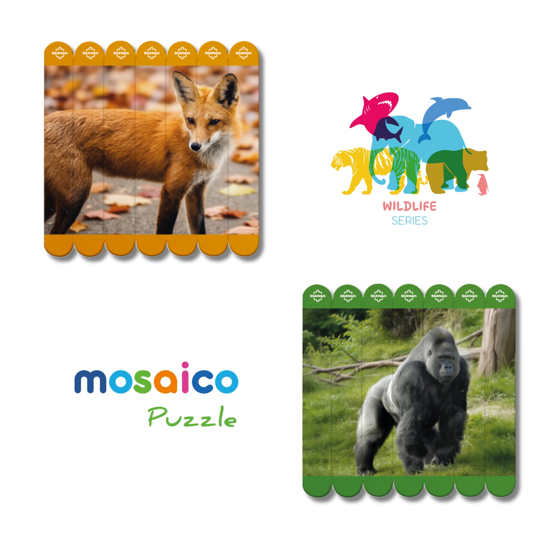 • Wildlife-themed wooden puzzles with fox and gorilla images and colorful wildlife and MOSAICO Puzzle logos