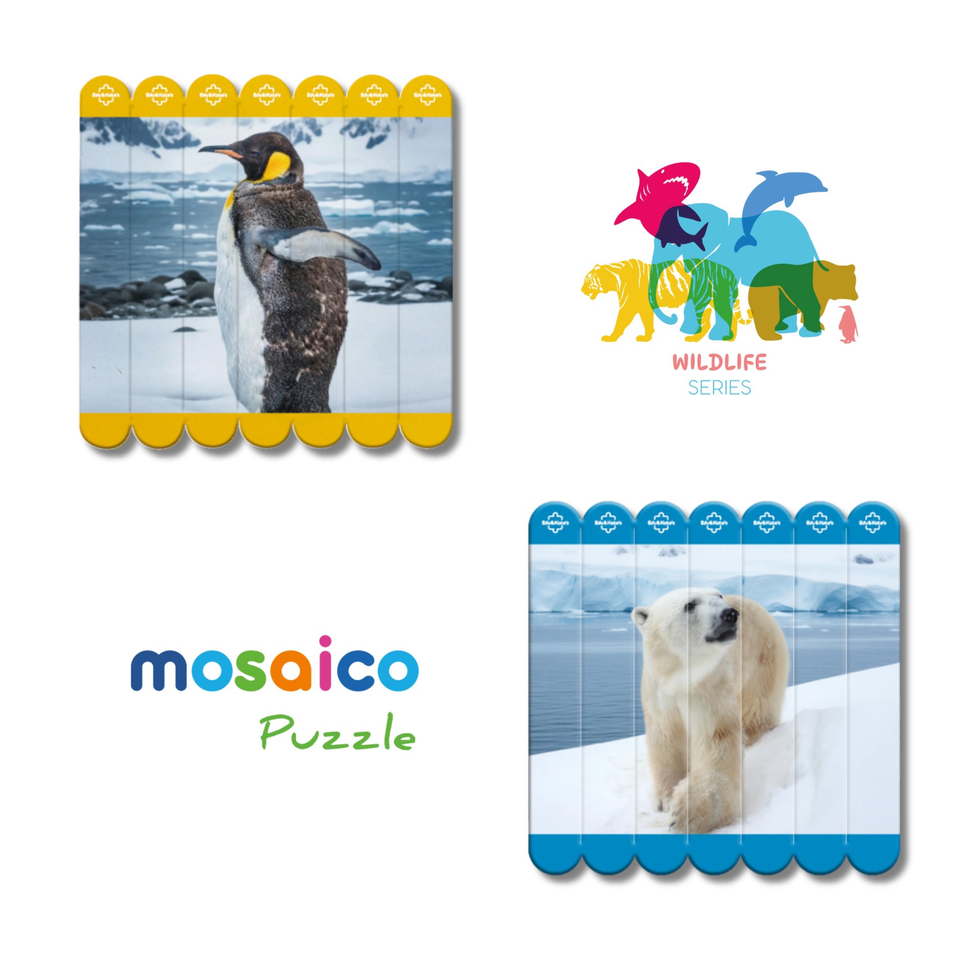 • Two wooden puzzles with penguin and polar bear images and mosaico Puzzle and WILDLIFE SERIES text