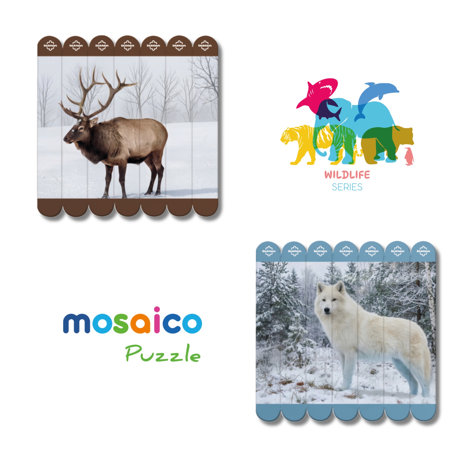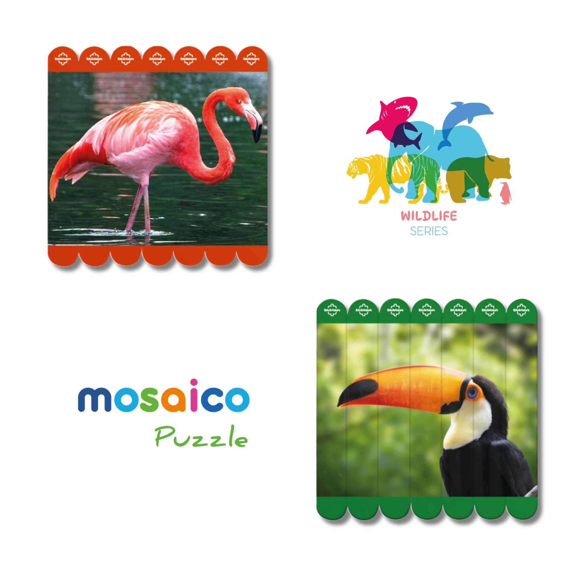 The Wildlife Series is an educational mosaic puzzle collection made up of 7 double-sided puzzles, offering a total of 14 different real animal images. Each puzzle features high-quality photographs of real animals, allowing children to closely observe details such as colours, textures, shapes and natural environments. Because the puzzles are double-sided, each board provides two different challenges, extending playtime and encouraging repeated use. The Wildlife Series was designed to bring children closer to wildlife and nature through visual exploration and hands-on puzzle play. These puzzles are suitable for use at home or in educational settings and support learning through observation, curiosity and play.