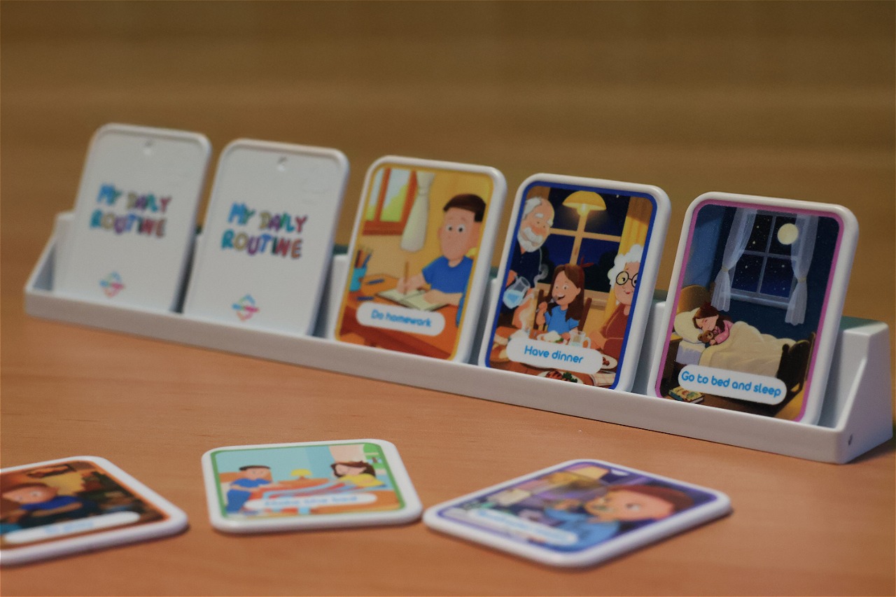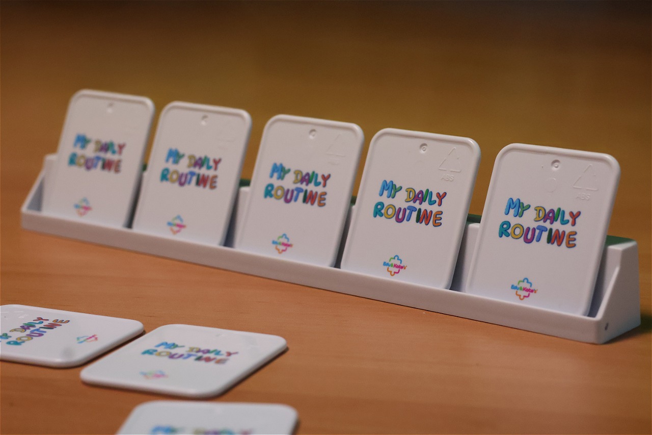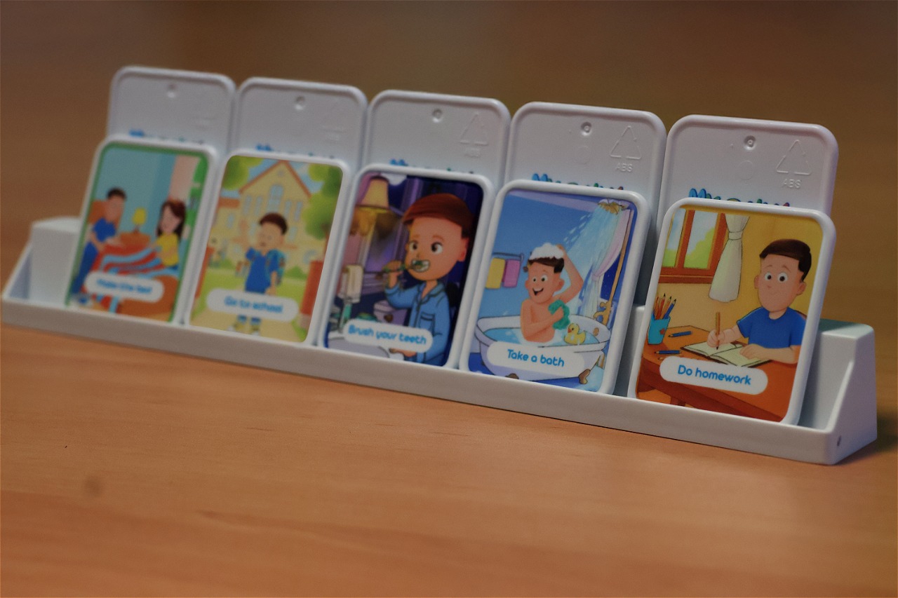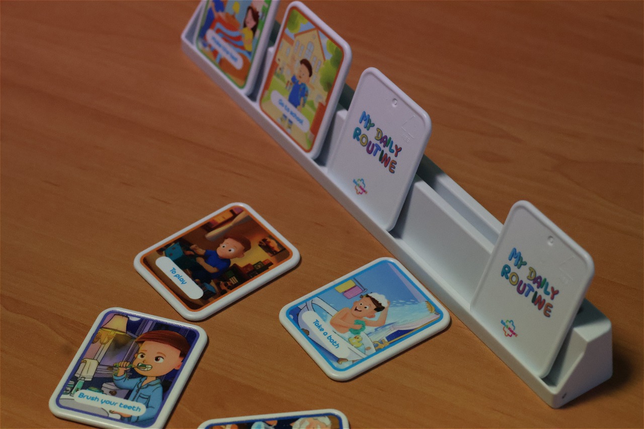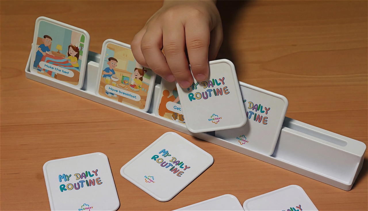 My Daily Routine is an educational game made up of 20 plastic cards featuring everyday activities, organized into morning, afternoon, and evening moments. Each card represents a common daily routine, such as waking up, getting dressed, having breakfast, going to school, playing, having dinner, or going to bed. Children can arrange the cards on a dedicated base to create the correct sequence of their day, and throughout the day they can flip each card as the task is completed. This visual system helps children understand the passage of time, organize their daily routine, and develop autonomy in a practical and intuitive way. The plastic material makes the cards durable and suitable for daily use, both at home and in educational settings.