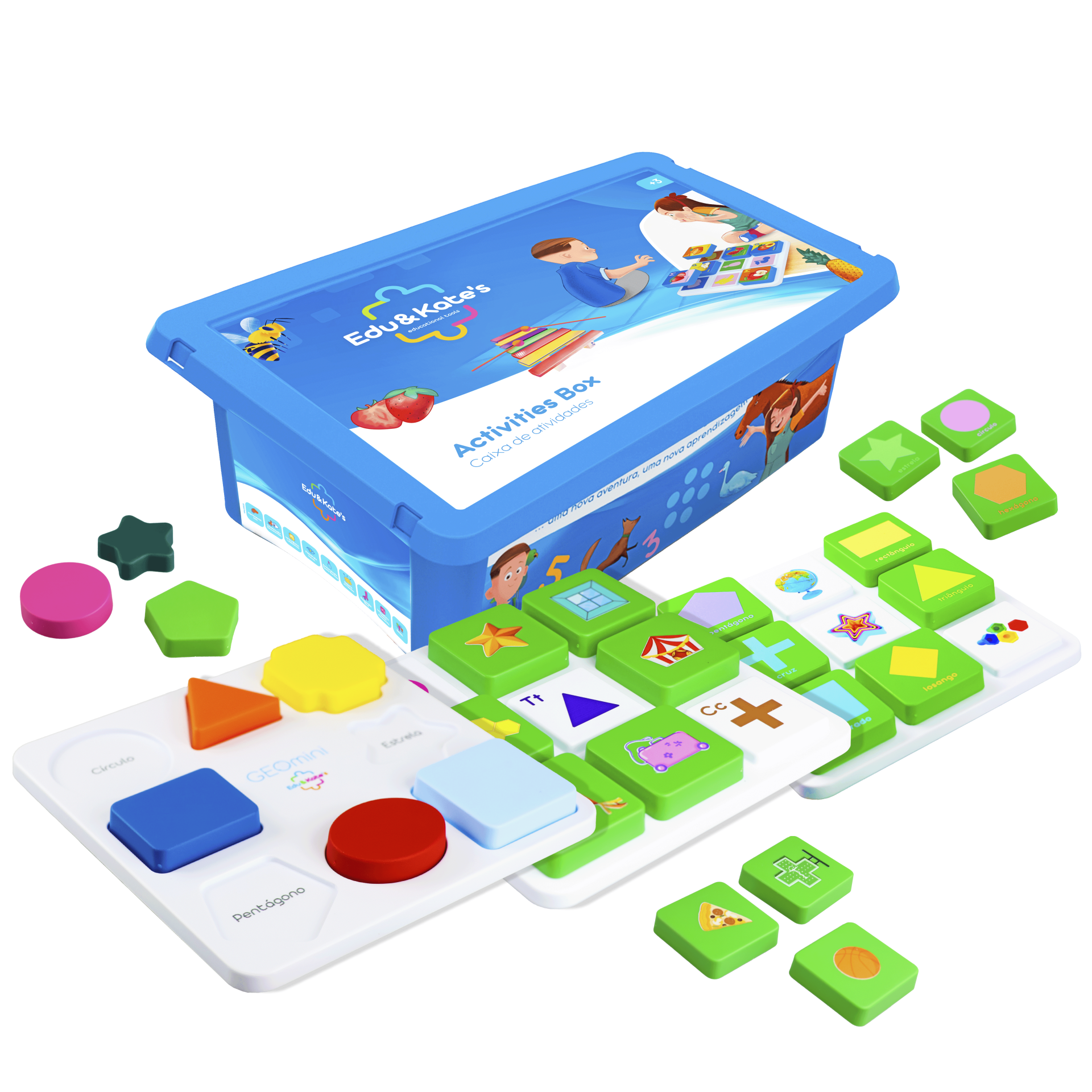 • Blue educational toy activity box with colorful shape and letter matching game pieces