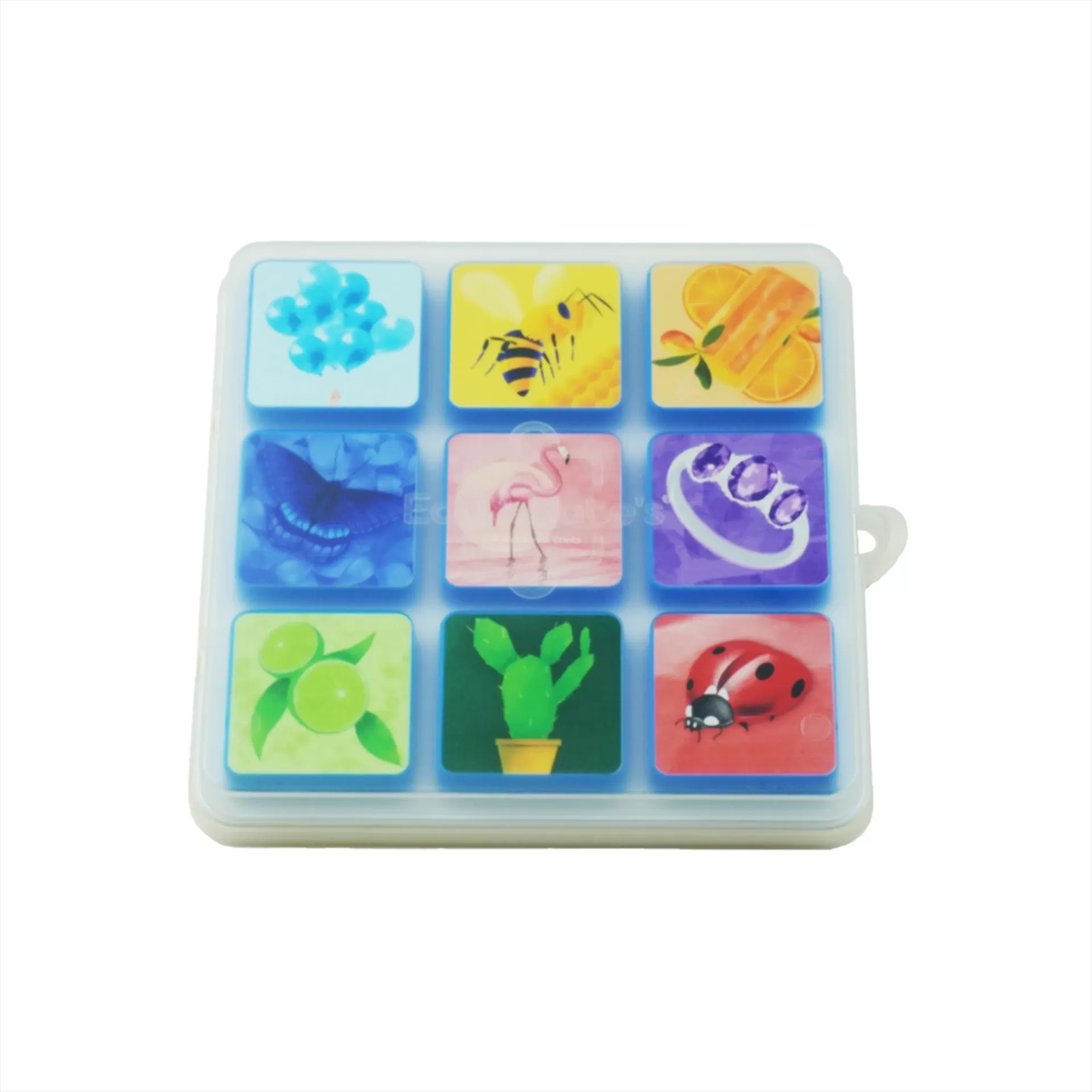 • White plastic container with nine compartments showing colorful images of fruits, insects, and plants.
