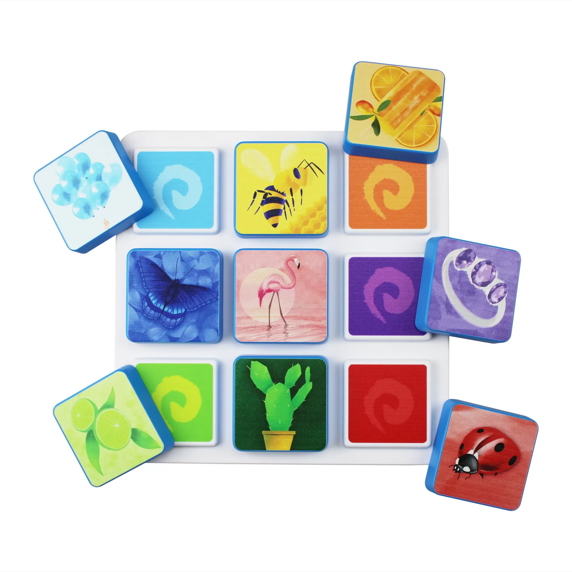 • 9 colorful square blocks with spiral patterns in a white tray