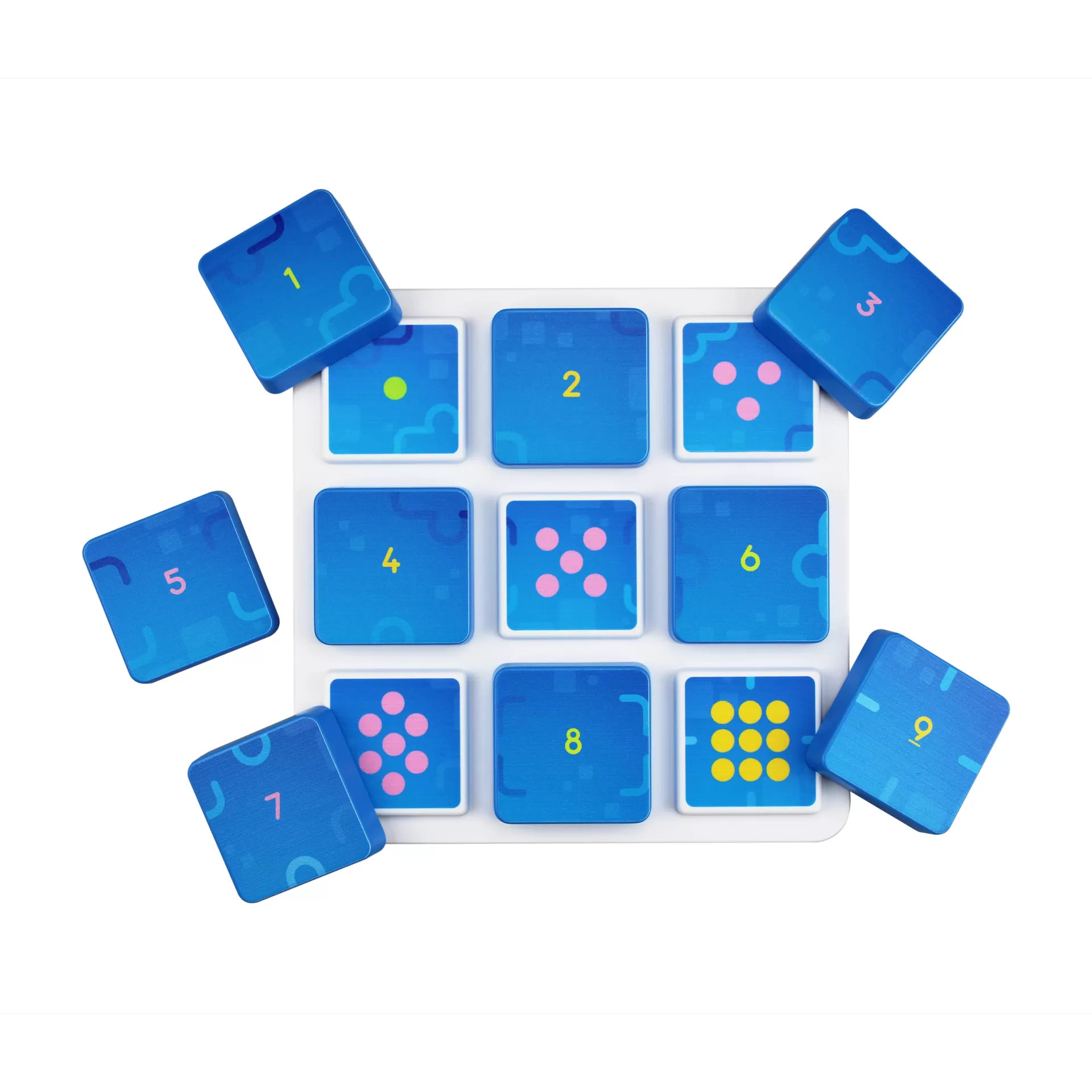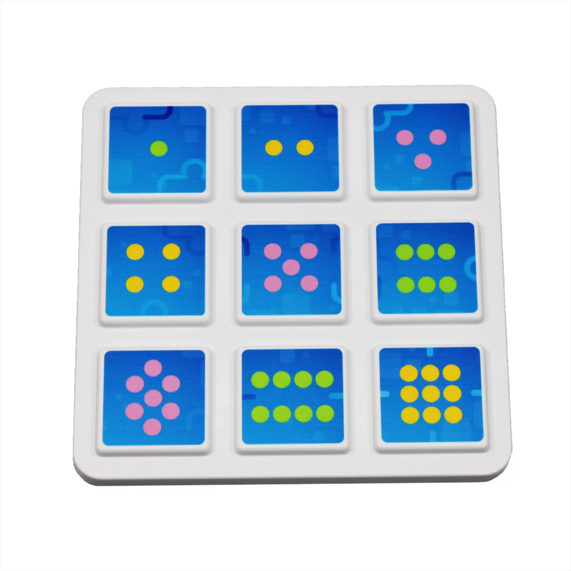 • Blue numbered square tiles with colored dots on white base educational toy