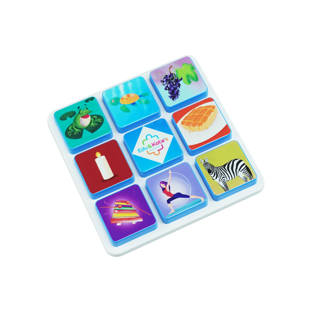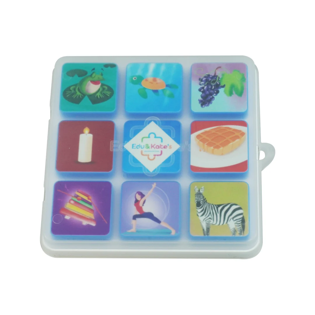 • White plastic case with nine colorful buttons showing various images and central Edu & Kates label
