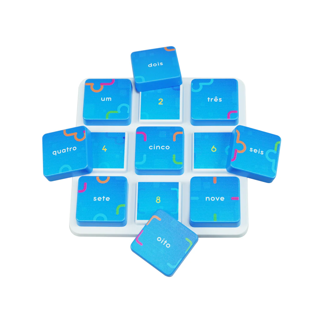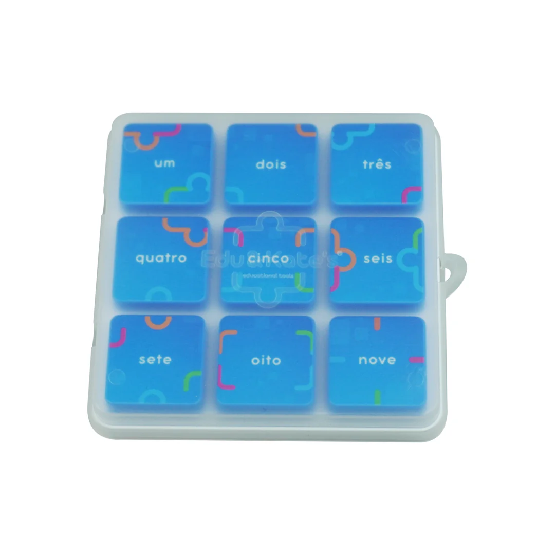 • White tray with nine blue tiles labeled with Portuguese numbers from one to nine.