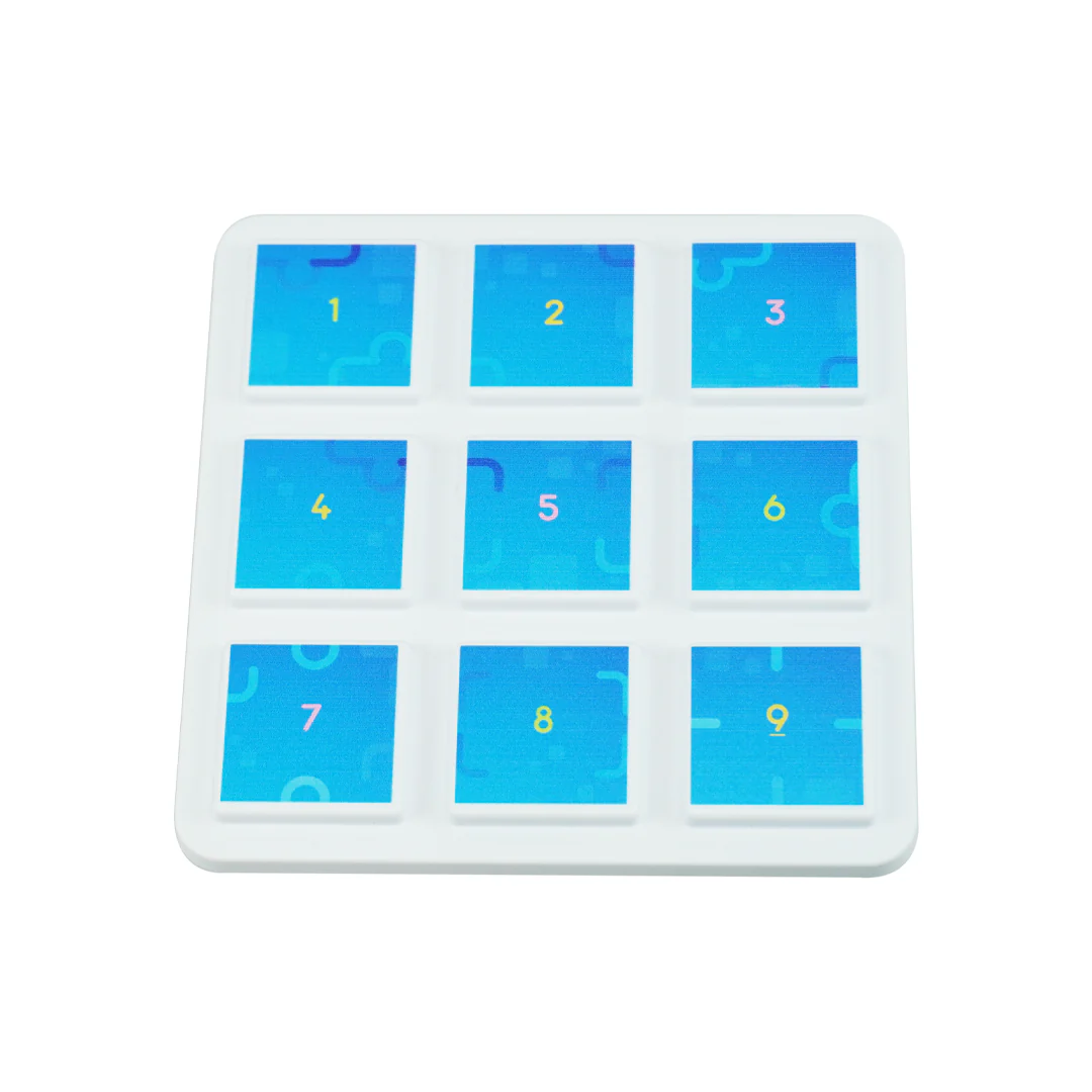 • White 3x3 grid tray with numbered blue squares from 1 to 9.