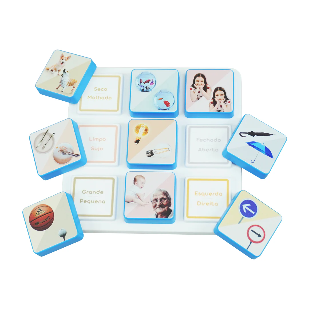 Super Combo Words – Opposites 1 – Opposites Association and Recognition is an educational game that helps children learn opposite concepts through the association between images and the corresponding words for pairs of contrasting ideas. The game includes pieces with illustrative images and their respective words, which children place on the board according to each pair of opposites, making learning more visual and interactive. It can be used at home or in educational settings to reinforce vocabulary and understanding of fundamental concepts such as big/small, hot/cold, fast/slow, and other basic opposites.