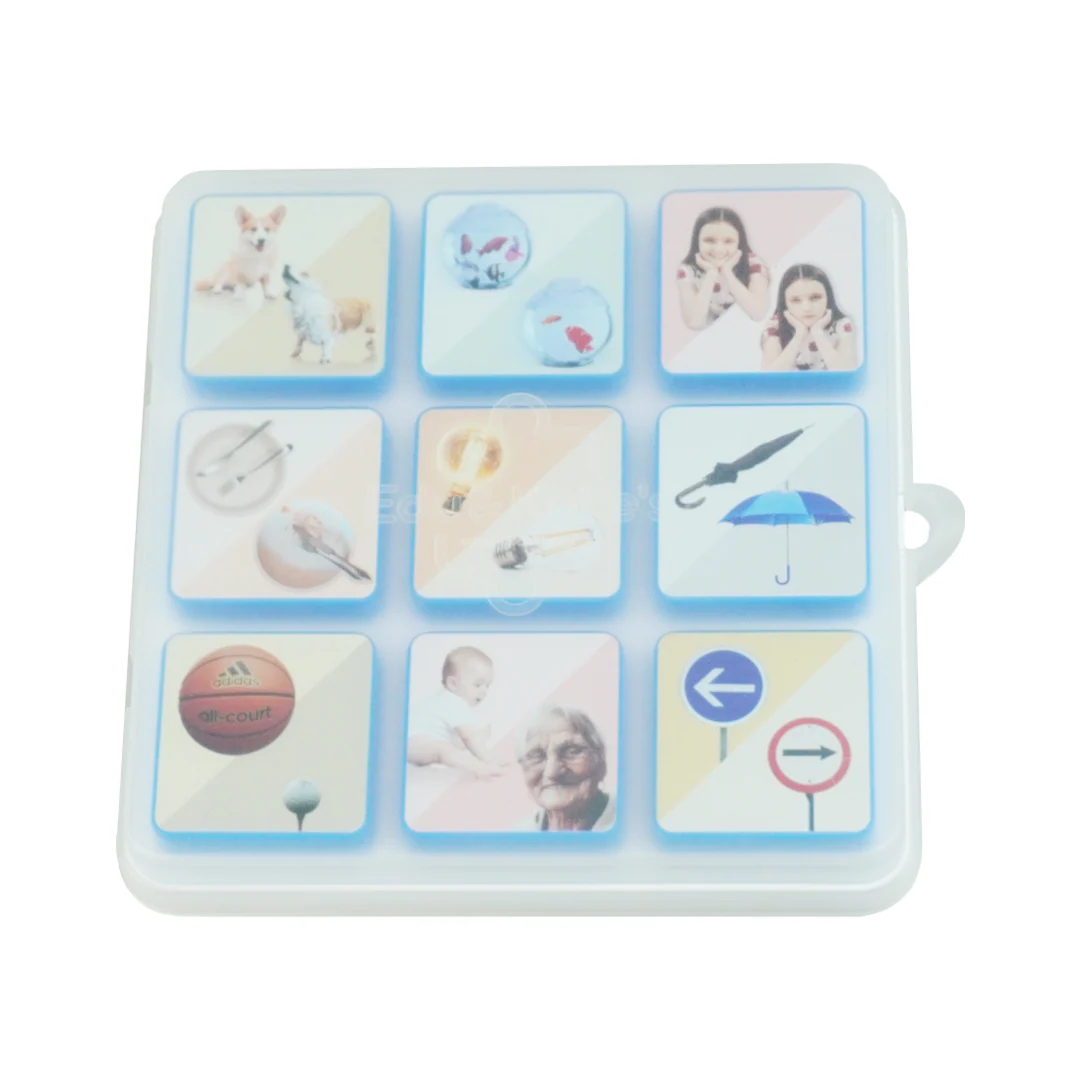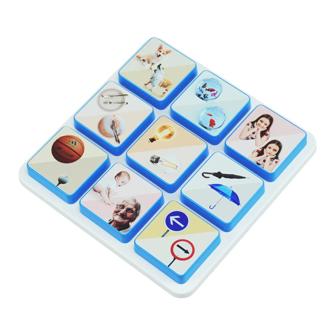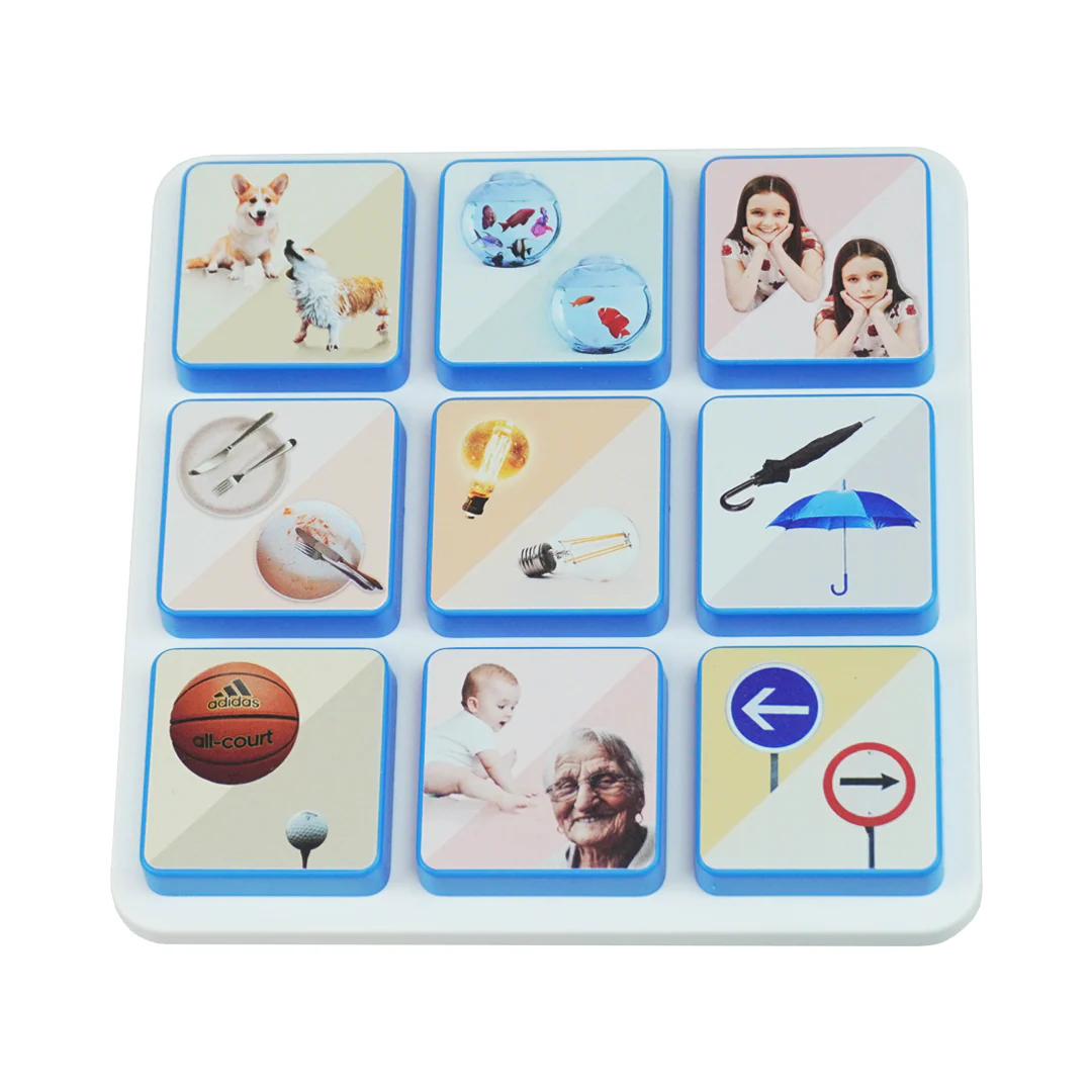 • Square board with nine removable blue-bordered tiles showing dogs, fish bowls, girl, cutlery, light bulbs, umbrellas, basketball, baby and elderly woman, and road signs.