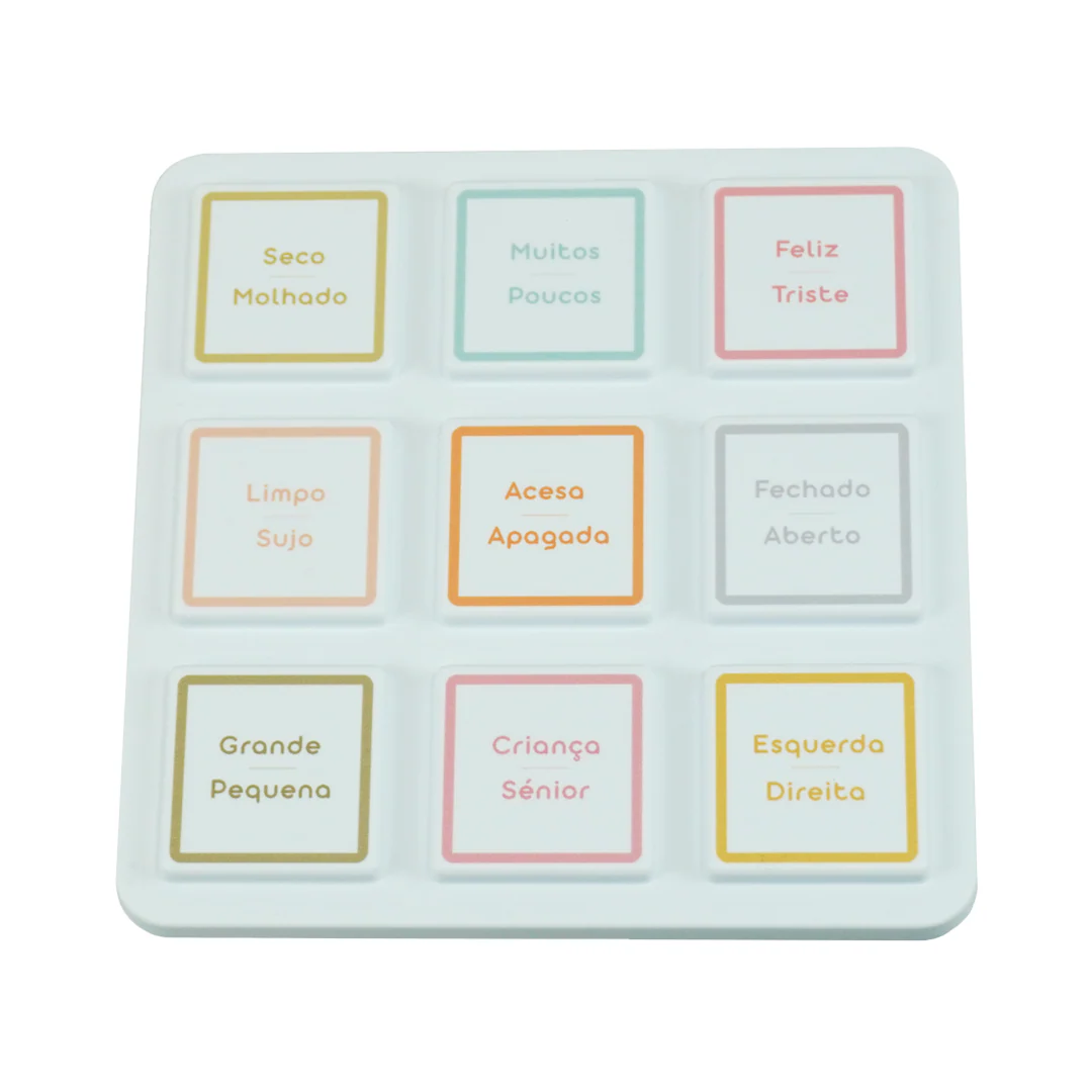 • White tray with nine colorful Portuguese word tiles in pastel borders